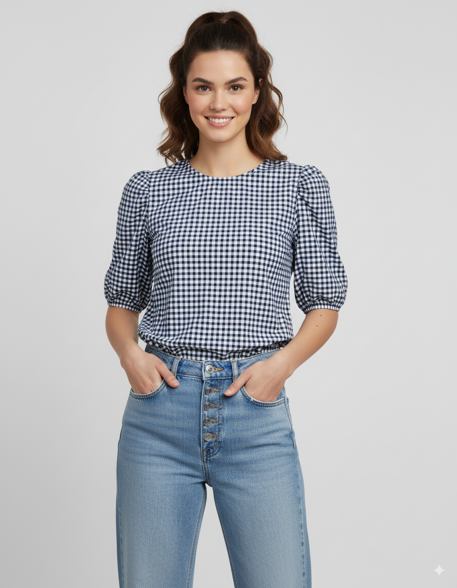La blusa Vania combina elegancia y frescura con un diseño de cuadros en dos tonos...