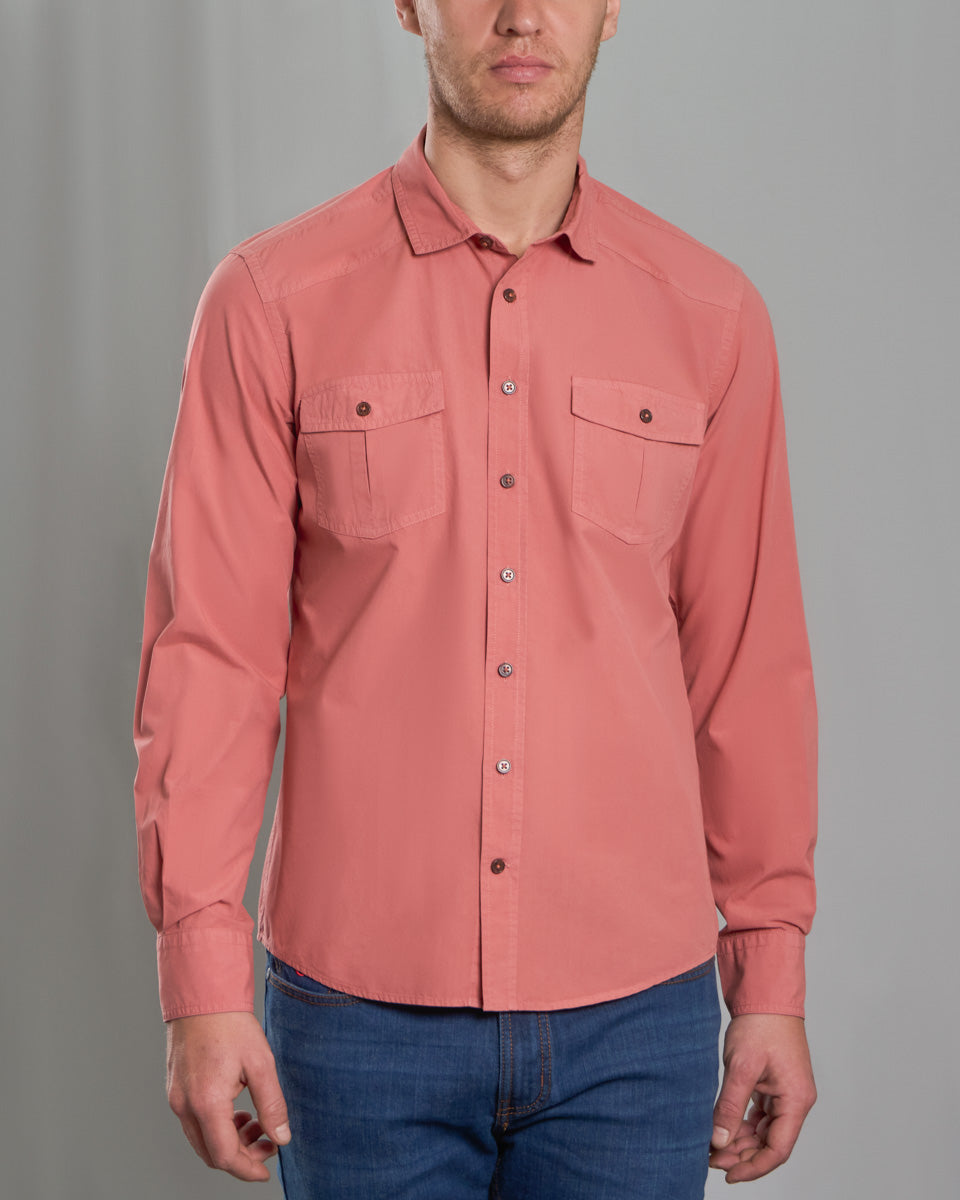 Camisa Casual color Melón con Detalles Azul en Cuello y Puños