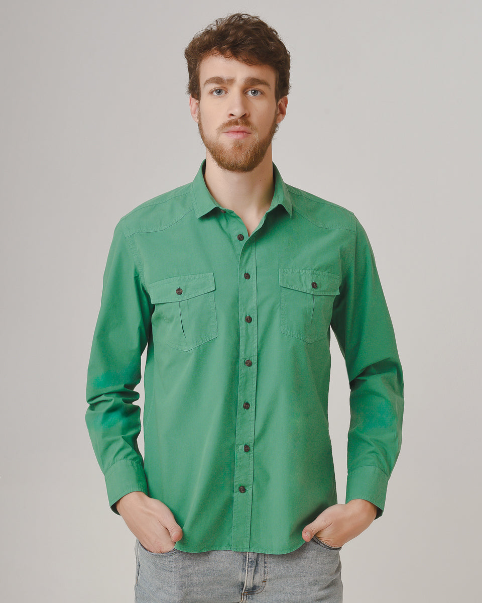 Camisa Casual - Verde con Contraste en el Puño, Cuello y Pechera