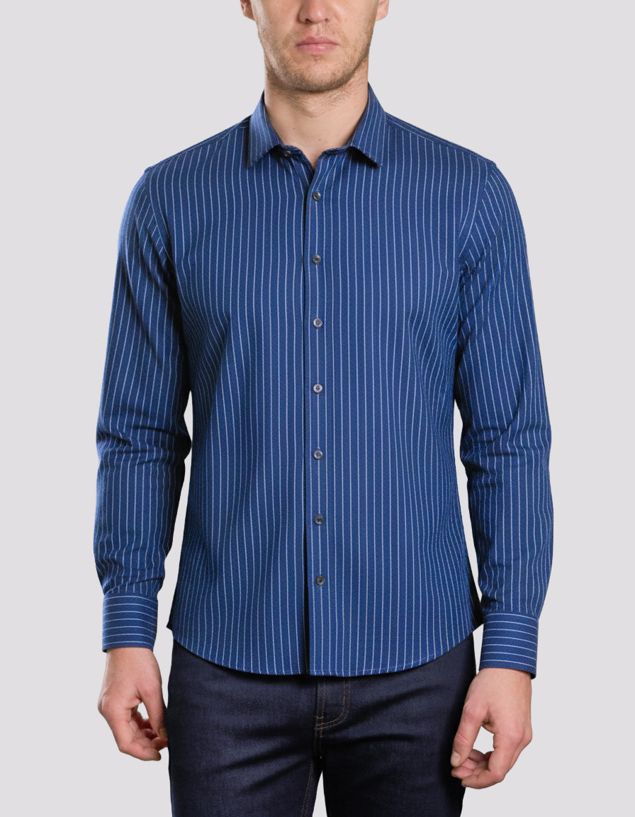 Camisa Casual - Azul con rayas Blancas con detalles en el Puño y Pechera