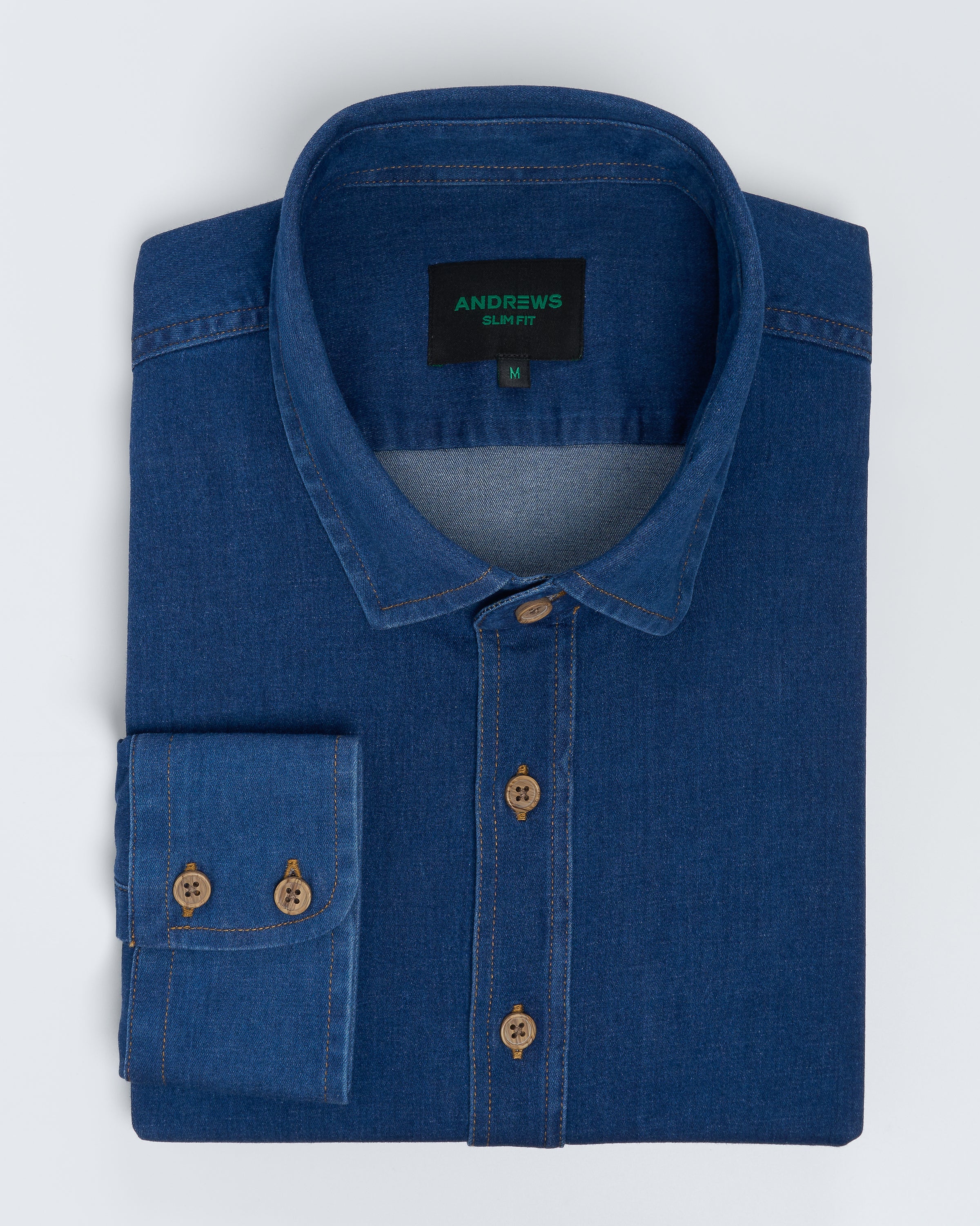 Camisa Casual denim stretch- Puño simple 2 botones slim azul