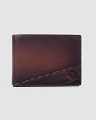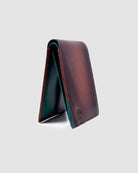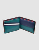 Billetera realizada en piel de vacuno auténtica con logotipo grabado. Interior en tonos verdes y azules.