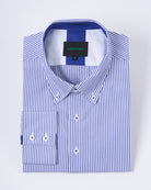 Camisa casual de algodón con diseño a rayas azules, perfecta para un look fresco y versátil. Su confección en 100% algodón garantiza suavidad, transpirabilidad y comodidad durante todo el día. Los detalles en color sólido en el puño, cuello y pechera aportan un contraste elegante que realza el diseño clásico de la prenda. Ideal para combinar con jeans o pantalones de vestir, esta camisa es una opción práctica y estilosa tanto para ocasiones casuales como para un estilo semiformal.