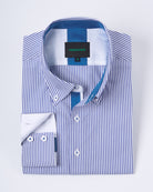 Camisa casual de algodón con diseño a rayas azules, perfecta para un look fresco y versátil. Su confección en 100% algodón garantiza suavidad, transpirabilidad y comodidad durante todo el día. Los detalles en color sólido en el puño, cuello y pechera aportan un contraste elegante que realza el diseño clásico de la prenda. Ideal para combinar con jeans o pantalones de vestir, esta camisa es una opción práctica y estilosa tanto para ocasiones casuales como para un estilo semiformal.
