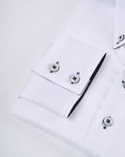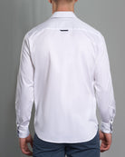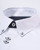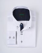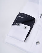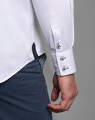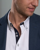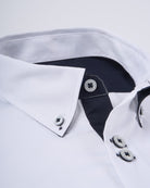 Camisa casual satinada en color blanco, diseñada para quienes buscan un estilo moderno con un toque de elegancia. Su tejido satinado ofrece suavidad al tacto y un sutil brillo que eleva la prenda. Los contrastes en azul oscuro presentes en el cuello, la pechera y los puños aportan carácter y distinción, creando un diseño equilibrado y sofisticado. Perfecta para ocasiones casuales con estilo o para looks semiformal, esta camisa combina versatilidad y refinamiento en cada detalle.