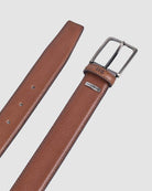 Cowhide leather. Adjustable, padded, and stitched. Buckle with a satin black nickel finish.