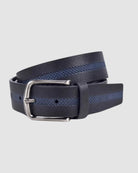 Embossed cowhide strap with a design. Combined with contrasting, faded leather.