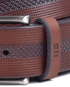 Embossed cowhide strap with a design. Combined with contrasting, faded leather.