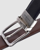 Reversible cowhide belt. A simple twist of the buckle reveals the chosen color. The buckle is identifiable and combines black nickel and satin black nickel finishes.