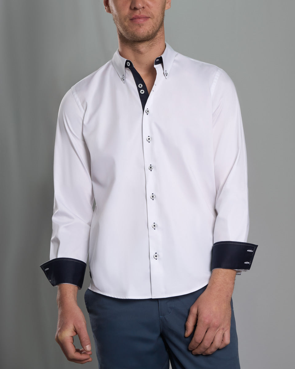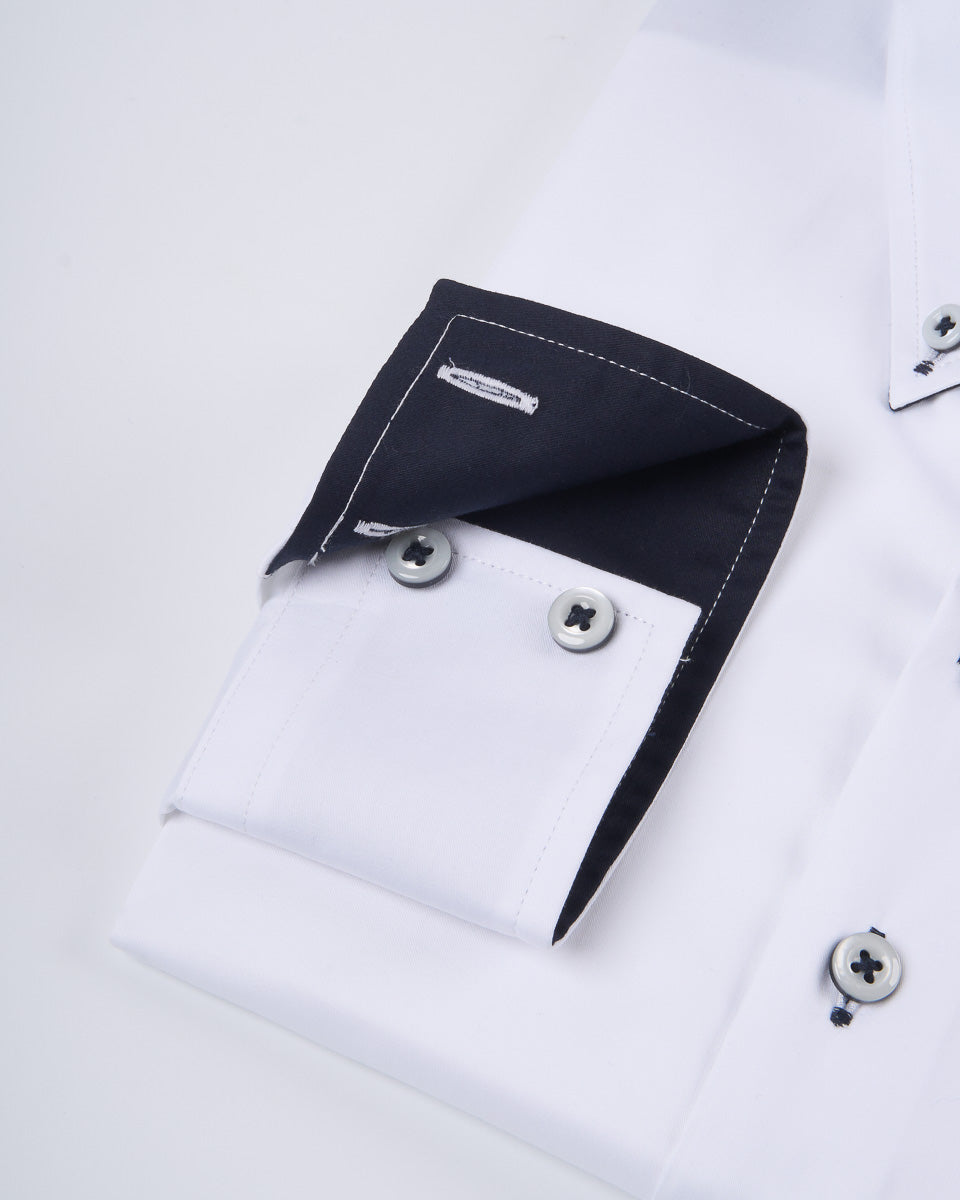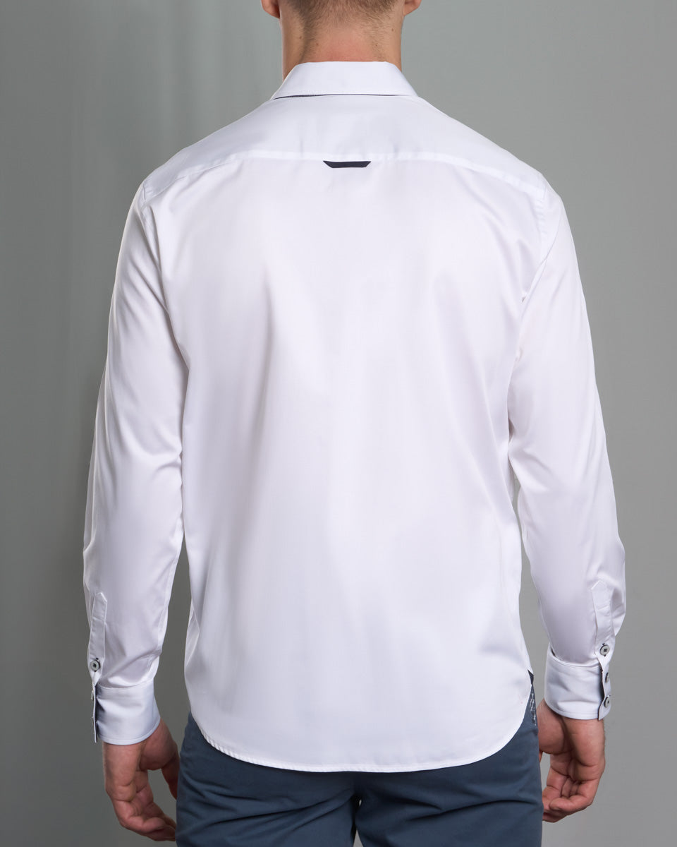 This white satin casual shirt is designed for those seeking a modern style with a touch of elegance. Its satin fabric offers a soft feel and a subtle sheen that elevates the garment. The dark blue contrasts on the collar, placket, and cuffs add character and distinction, creating a balanced and sophisticated design. Perfect for stylish casual occasions or semi-formal looks, this shirt combines versatility and refinement in every detail.