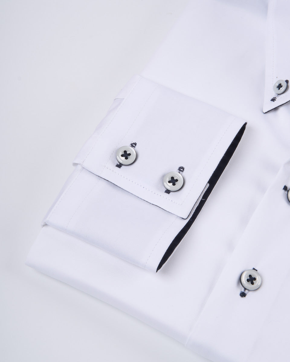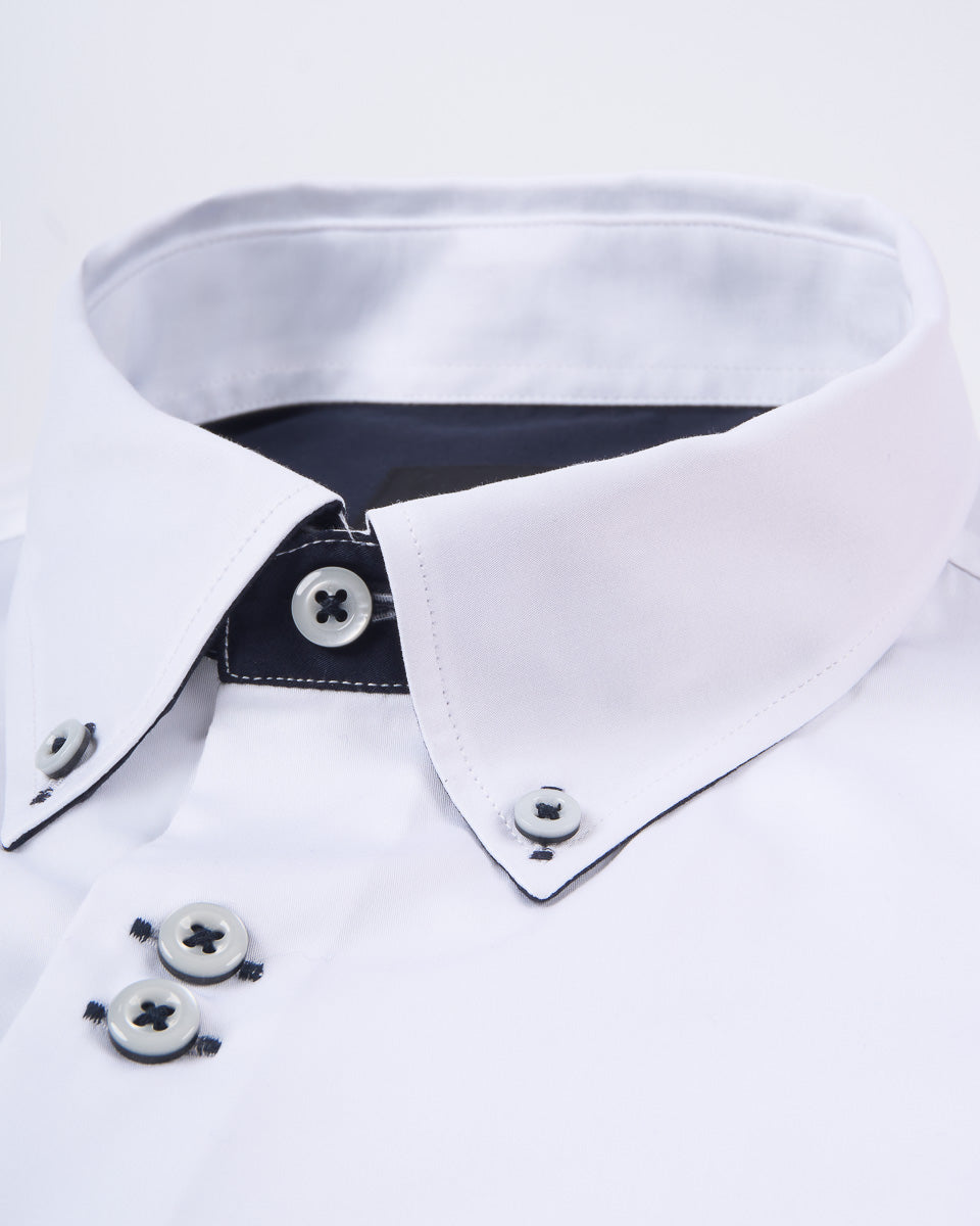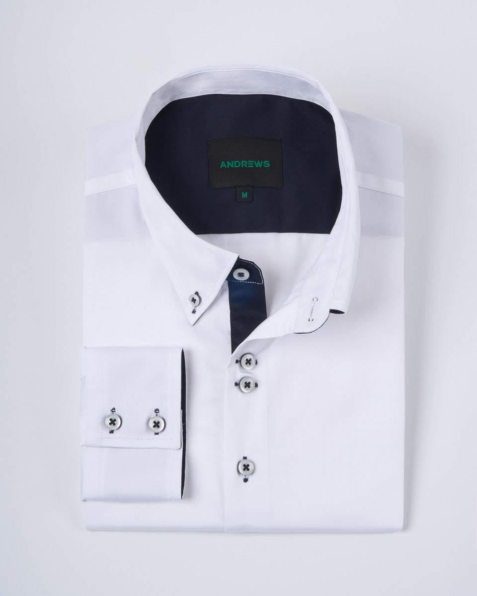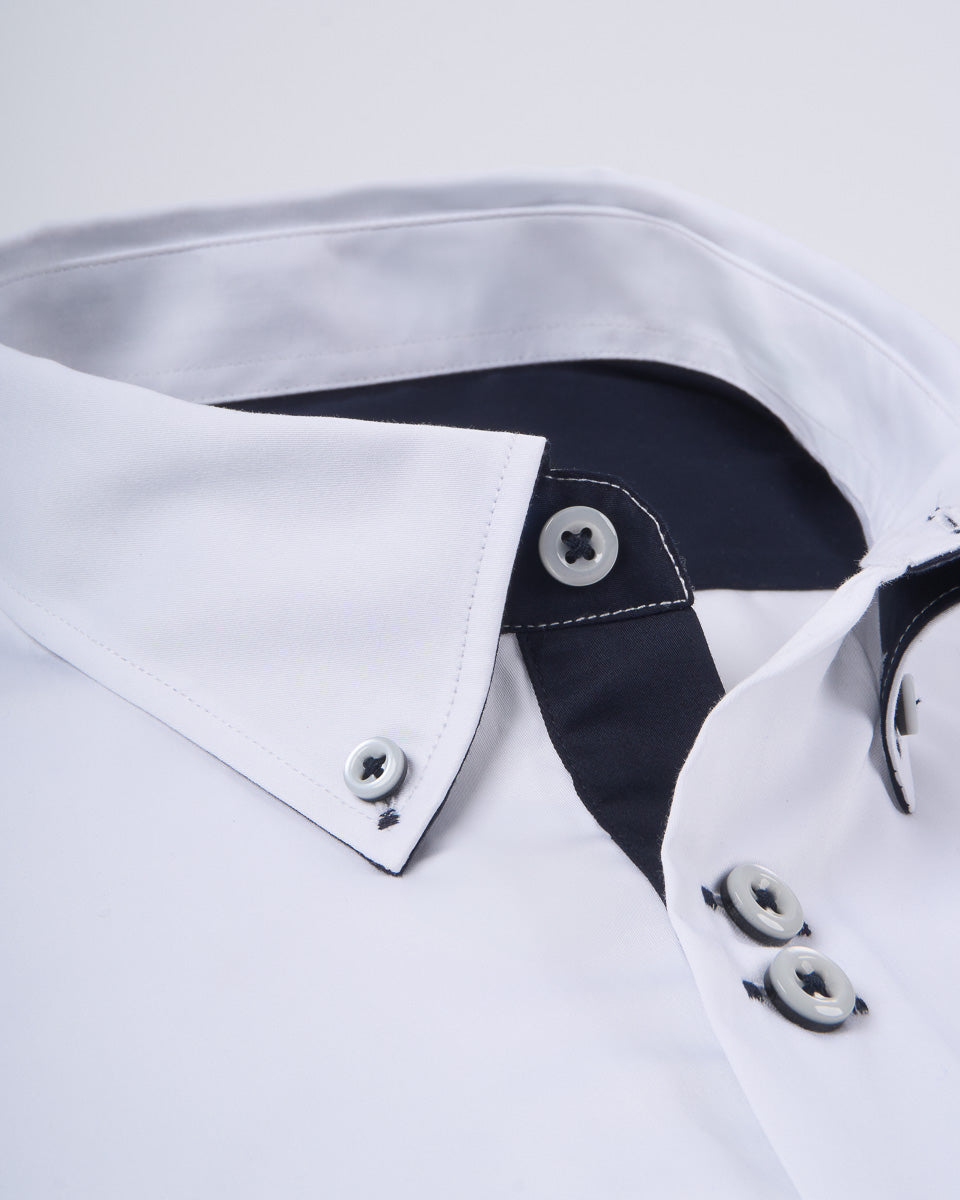 This white satin casual shirt is designed for those seeking a modern style with a touch of elegance. Its satin fabric offers a soft feel and a subtle sheen that elevates the garment. The dark blue contrasts on the collar, placket, and cuffs add character and distinction, creating a balanced and sophisticated design. Perfect for stylish casual occasions or semi-formal looks, this shirt combines versatility and refinement in every detail.