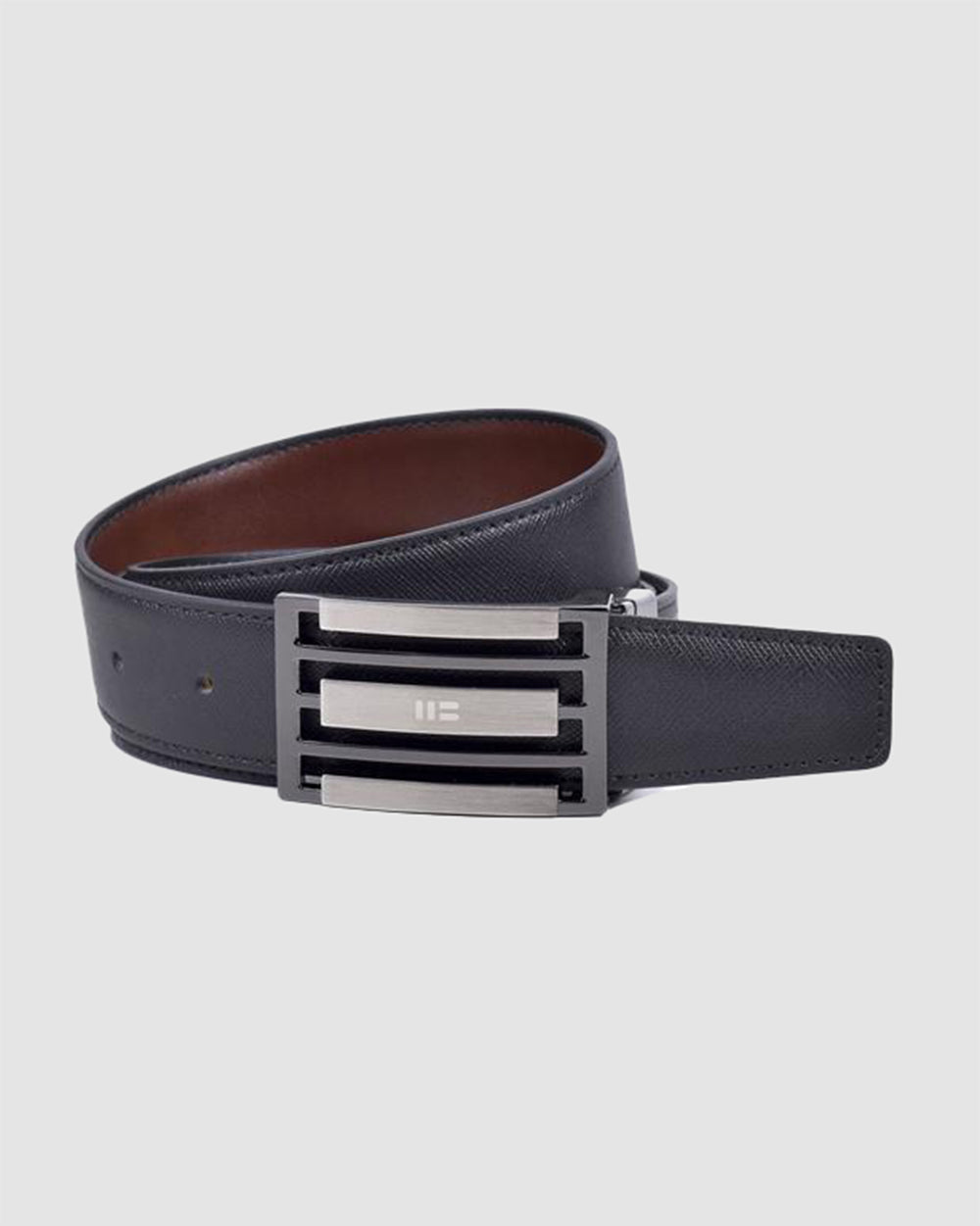 Reversible cowhide strap. A simple twist of the buckle reveals the chosen color. The pin-style buckle is identifiable and combines black nickel and satin black nickel finishes.