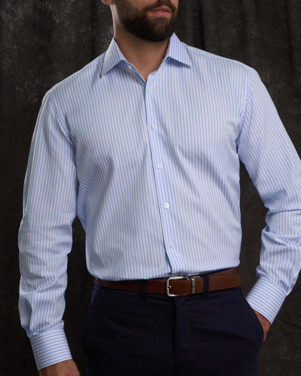 Elegancia Atemporal : Confeccionada en nuestro fino tejido de popelín, esta camisa es un básico imprescindible para cualquier guardarropa. Su superficie suave y lisa ofrece una gran durabilidad. Perfecta para combinar con una corbata de estampado audaz y un traje azul oscuro, o llevarla sin corbata para un estilo más relajado pero impecable.