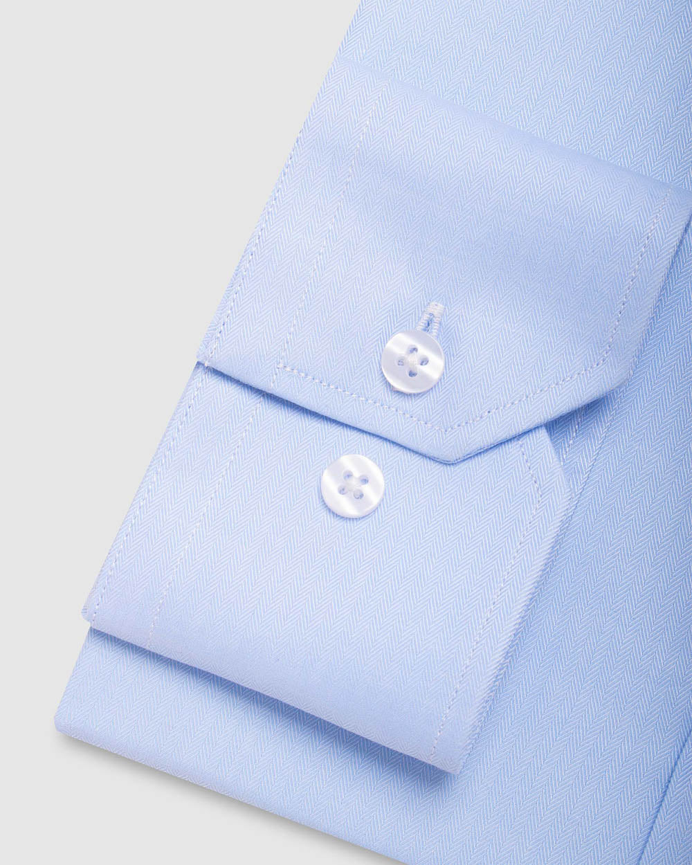 Una preciosa camisa de dobby con detalles en el cuello y el puño. Confeccionada con el tejido Dobby de Andrews, de rica textura y elegante brillo, y con un acabado resistente a las arrugas, el dobby está tejido con un hilo base blanco junto con dos sutiles tonos de lila para crear una elegante textura en 3D perfecta para la ropa de negocios.