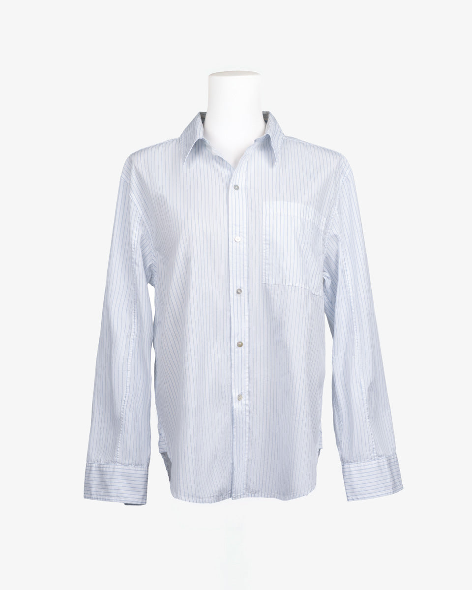 Blusa tipo camisa para mujer en color blanco con delicadas rayas azules claras, diseñada en un corte amplio que brinda comodidad y estilo relajado. Su diseño incluye un práctico bolsillo en el pecho que añade un detalle funcional y moderno. Ideal para looks casuales o para combinar en un estilo smart-casual, esta prenda es versátil y fresca, perfecta para el día a día.