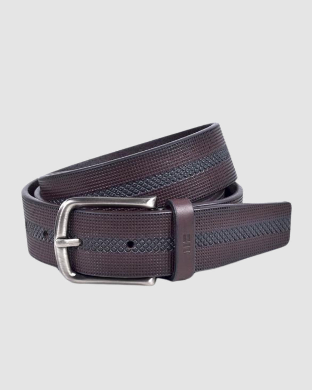 Correa de piel de vacuno grabada con diseño. Combinada con piel en contraste de color y difuminada.