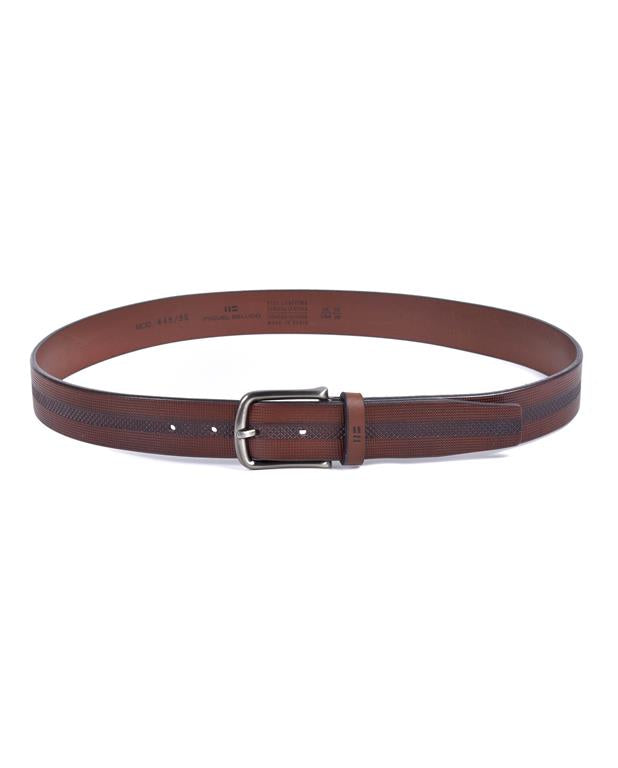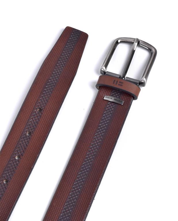 Correa de piel de vacuno grabada con diseño. Combinada con piel en contraste de color y difuminada.