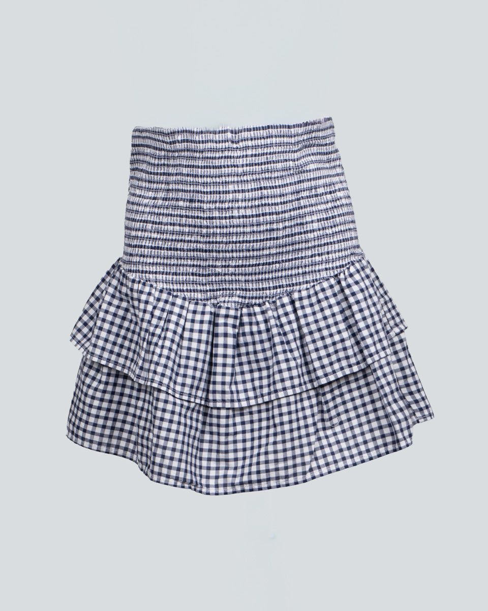La falda Vania destaca por su encanto clásico y femenino. Confeccionada en tela a cuadros azul con blanco, combina una parte superior con delicadas costuras multiagujas que aportan estructura y un ajuste favorecedor, mientras que la parte inferior fluye con elegantes pliegues que añaden movimiento y estilo. Ideal para crear looks versátiles con un aire sofisticado y actual.