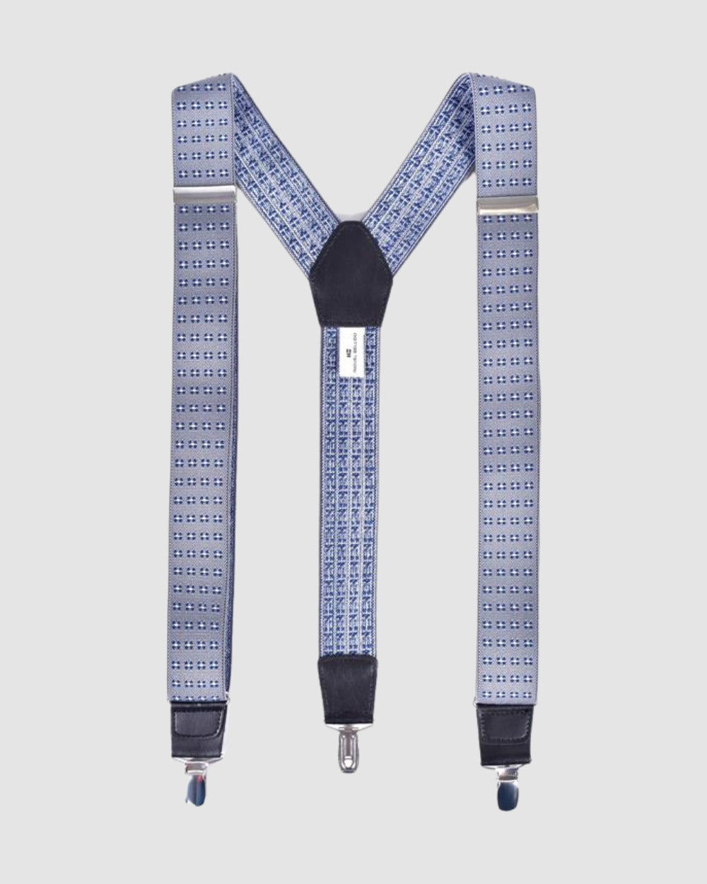 Tirantes de cinta elástica con pequeños motivos a contraste con el color del fondo. Los terminales son de piel legítima con el logotipo de la marca grabado a fuego. Sistema de sujeción uso sencillo para pinza metálica